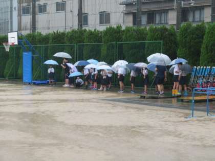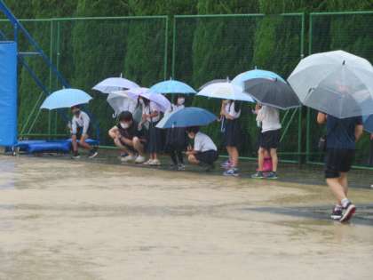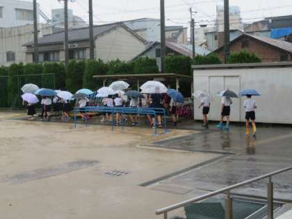 4年生が理科の学習「雨水の行方と地面の様子」で、運動場の雨水の流れと地面の傾きなどの関係に着目して観察していました。