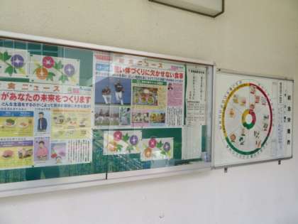 栄養教諭と給食員会の児童が今日の献立を書いたり、掲示物を掲示したりしています。