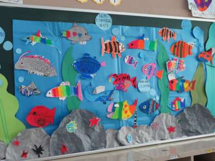 背面黒板には、一人ひとりの表現力を生かした「海の中の世界」が掲示されていました。
