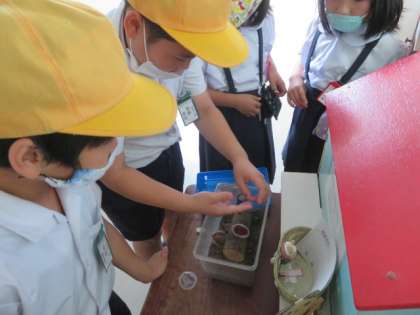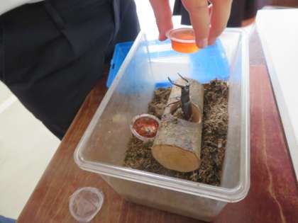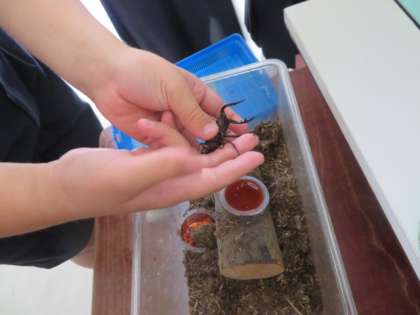 先日来、校長室前にノコギリクワガタの入った飼育箱を置いていると、興味関心のある子どもがよく観察しに来てくれます。