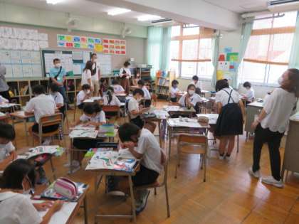 日本の気候の特色をグループに分かれて考え、まとめていました。