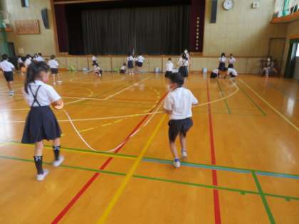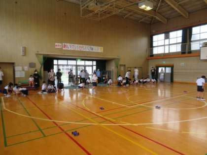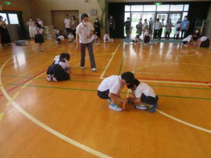 2時間目の教室での学習に続いて「風とゴムのはたらき」を、3時間目は講堂で実験を通して学習していました。