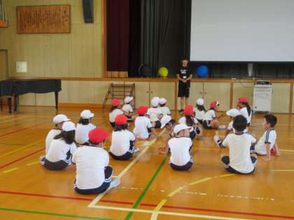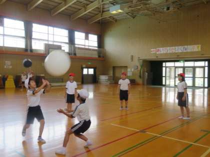 4年生が大きなキンボール用のボールを使っての運動をしていました。