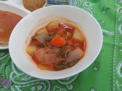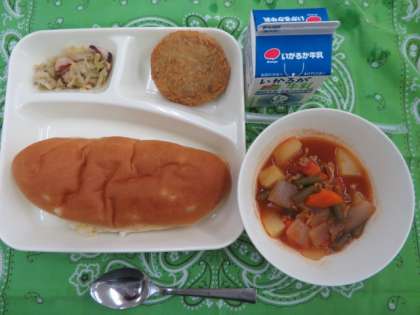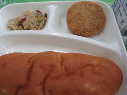献立は、チキンレバーカツ、ケチャップ煮、たことキャベツのソテー、おさつパン、牛乳でした。