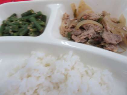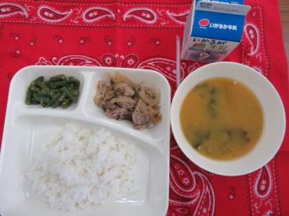 献立は、豚肉の生姜焼き、みそ汁、さんど豆の胡麻和え、ごはん、牛乳でした。
