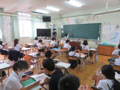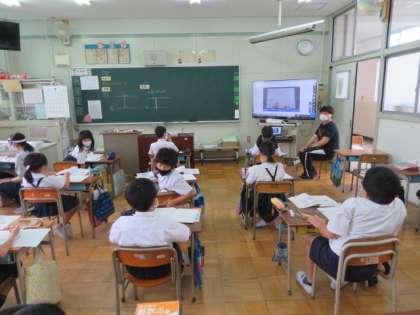 大型モニターでは、左利きの子どもたちのための作図の仕方を映していました。