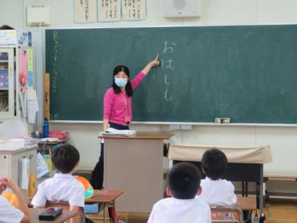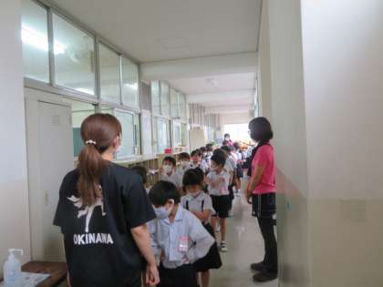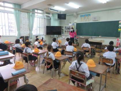まずは、各教室ごとに「おはしも」(押さない)(走らない)(しゃべらない)(戻らない)の合言葉から避難時の注意について指導しました。