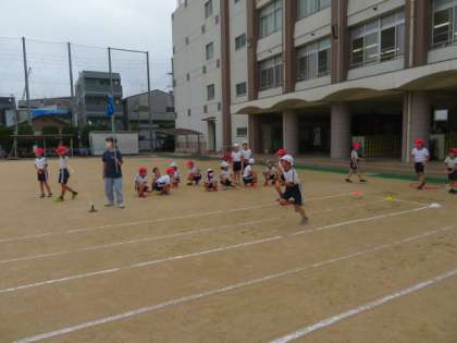 3年生も、講堂でインストラクターの先生による準備運動、ストレッチ体操、足が速くなるダンスでウォーミングアップを十分にした後、運動場へ出てきて50m走の測定をしました。