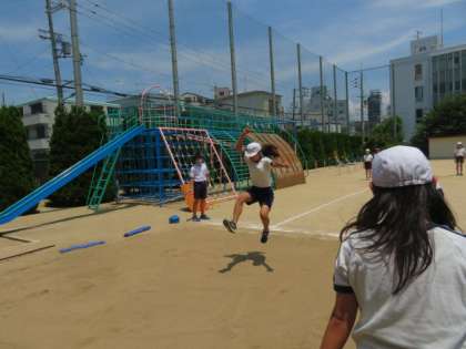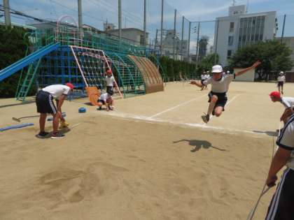 「走り幅跳び」では、強い踏切りと助走のリズム、踏み切った後高く跳ぶことをめあてとして、それぞれ工夫されたコースで練習しました。