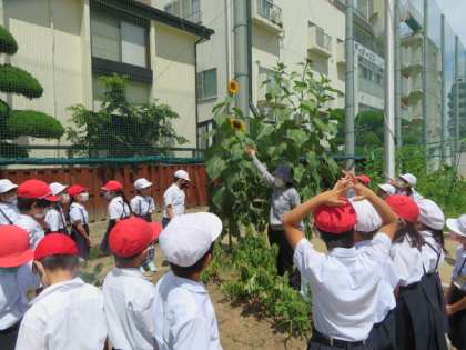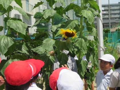 ひまわりの高さを計ったり、種の様子を観察したり、ホウセンカの成長を観察したりしていました。