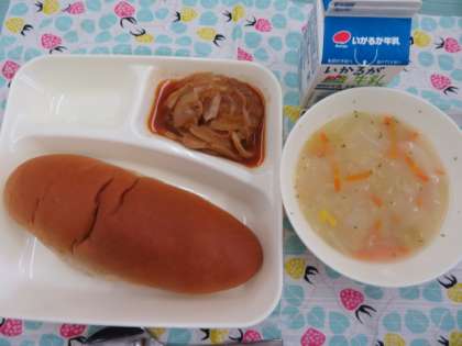 献立は、煮込みハンバーグ、コーンスープ、黒糖パン、牛乳でした。