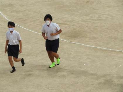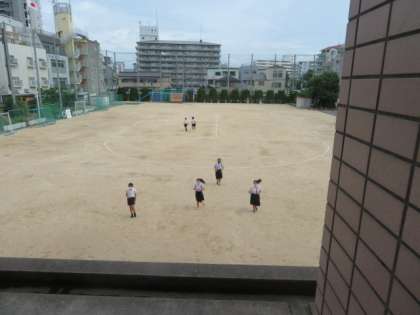 まずは、用意した靴下をはいたまま運動場へ出て、汚れをさらにつけます。