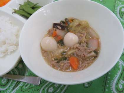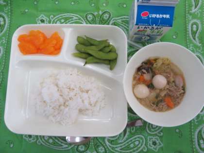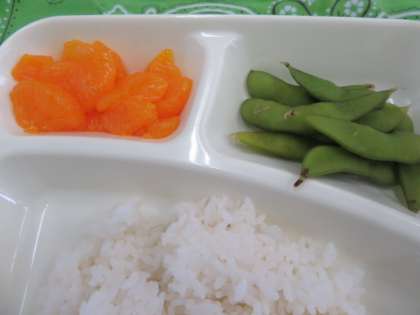 献立は、八宝菜、枝豆、みかん(缶)、ごはん、牛乳でした。