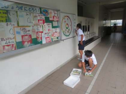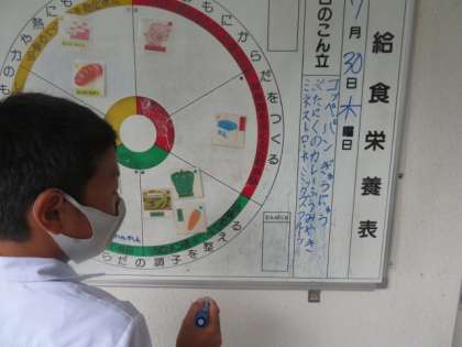毎朝、その曜日を担当している給食委員会児童が、今日の給食献立を書いたり、掲示物を選んで貼ったりしています。