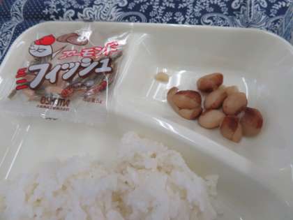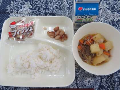 献立は、肉じゃが、とら豆の煮もの、アーモンドフィッシュ、ごはん、牛乳でした。