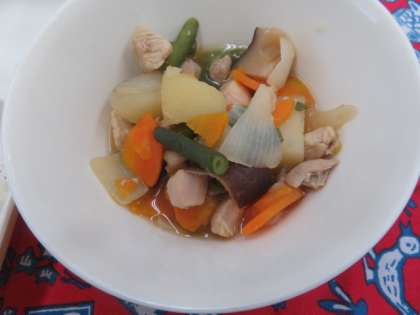 献立は、鶏肉とじゃがいもの煮物、紅ざけそぼろ、ごはん、牛乳でした。