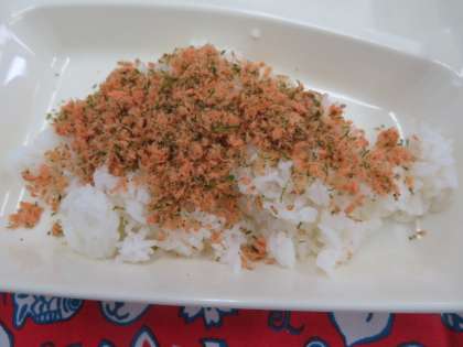 紅ざけのそぼろは、いりごまと青のりも入り、ていねいに調理されていました。ごはんの上にふりかけると、いりごまと青のりの風味とさけの塩味でとてもおいしくいただきました。