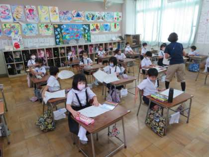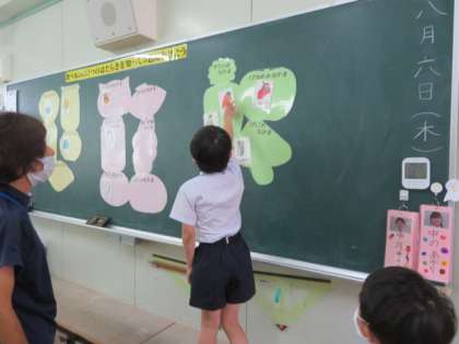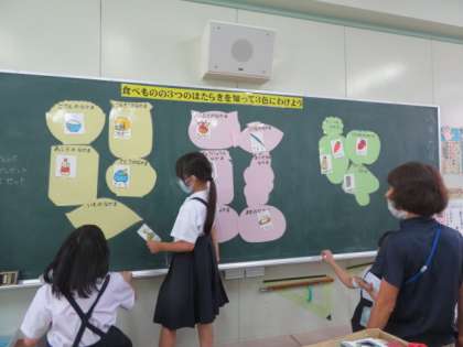 手に取った食品カードを3つのグループのどこに入るかを考えて黒板の掲示物に貼りに行きます。