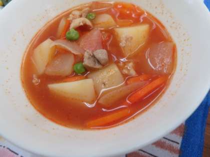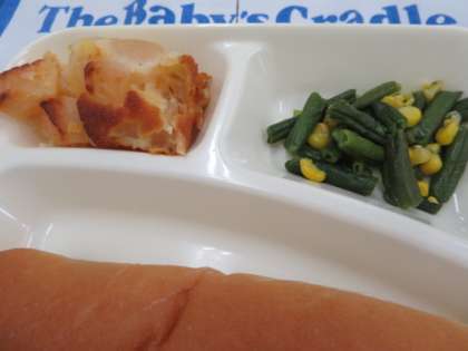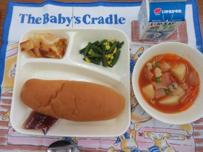 献立は、ケチャップ煮、さんど豆とコーンのソテー、りんごのクラフティ、コッペパン、いちごジャム、牛乳でした。