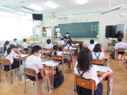 声を出す歌唱の授業はなかなか難しいですが、マスクをして行っています。今日は新しい曲「まきばの朝」を習いました。