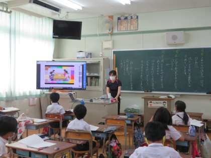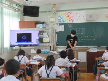4年2組は、理科でカシオペア座から北極星を見つける方法についてDVDを視聴しながら学んでいました。