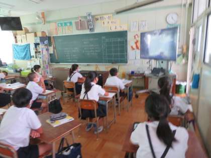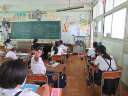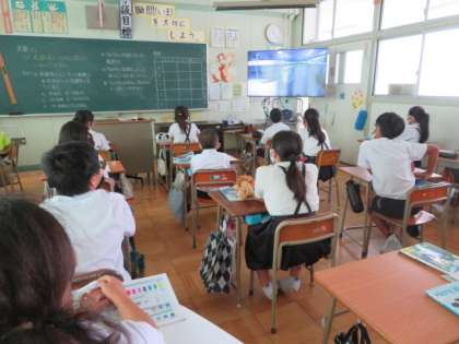 大型モニターに理科の教材DVDを映して、学習の振り返りとまとめをしていました。