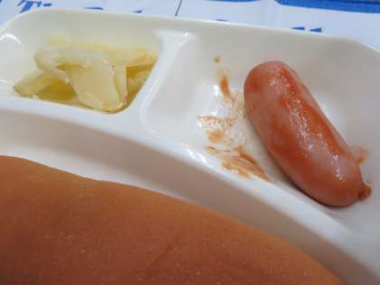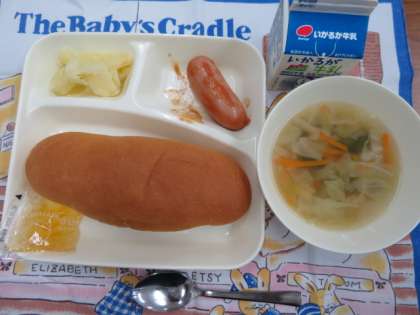 献立は、フランクフルトのケチャップソース、スープ、焼きじゃが、マーマレード、コッペパン、牛乳でした。