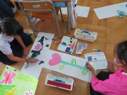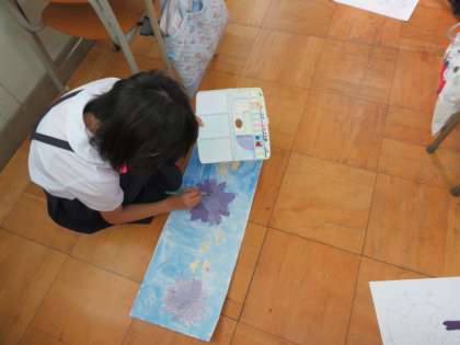 四つ切画用紙を縦1/2に切って、まぼろしの花というテーマで描いていました。
