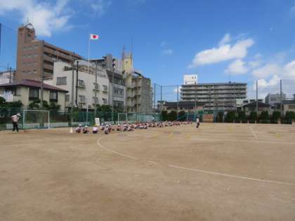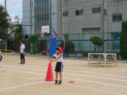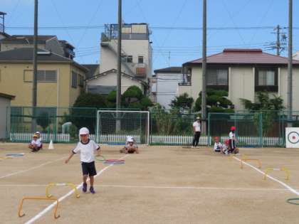 子どもたちに走る順やしようがい物の置き方などいろいろと考えさせ、自分たちだけの折り返しリレーにチャレンジしています。