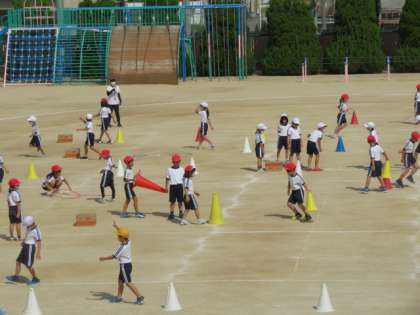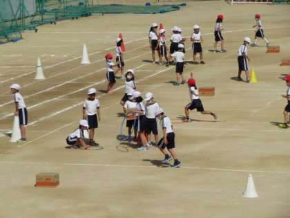 毎時間、障がい物をどこに置くのが良いか、走る順はどうするか考え話し合って折り返しリレーを真剣に楽しんでいます。