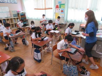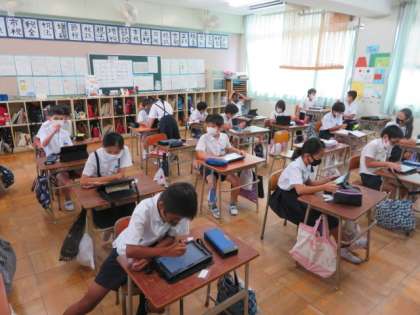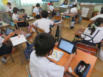 5年2組では、双方向通信システムTeamsを使いこなせるように、各自がタブレット端末からログインして、試しの意見交換などをするなど操作や手順に慣れるような活動をしていました。