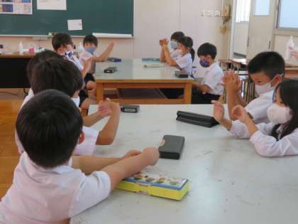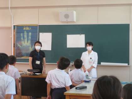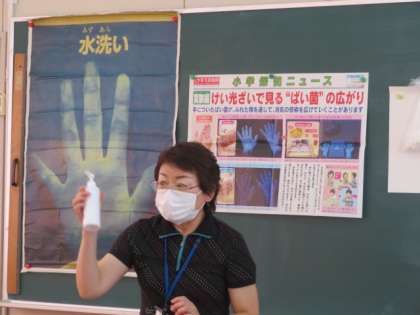 学校薬剤師の方にも来ていただいて、養護教諭による2年生対象の「手洗い指導」を行いました。