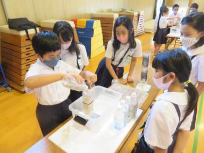 初めに水道局や水道についての説明DVDを視聴した後、1・2組それぞれ4グループずつに分かれて浄水の実験を行いました。