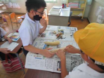 学習園で観察活動を終えた子どもたちが、ヘチマやゴーヤなどの種や干してできたヘチマのたわしなどを教室へ持ち帰っていました。