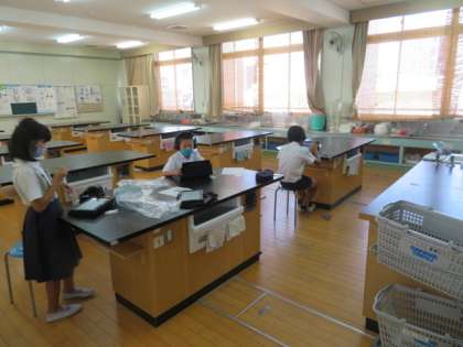 さて、1時間目は、学級教室から離れたいろいろな教室でタブレット端末を使いTeamsの校内接続テストとリモート授業を行っています。