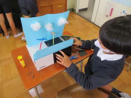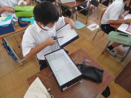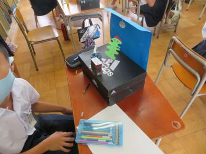 家庭から持ってきた箱を使い、背景も工夫しています。