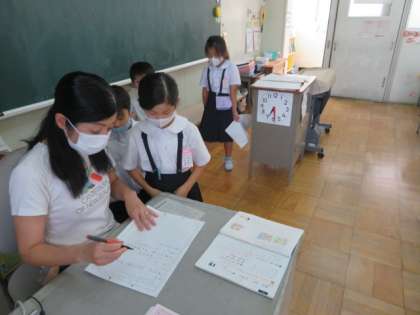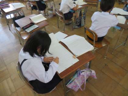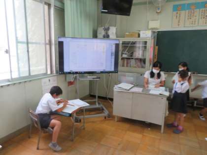 お話を作って書こうの学習で、自分がまとめてきたお話のメモや大型モニターの原稿用紙の使い方を参考に原稿用紙に書き綴っていました。
