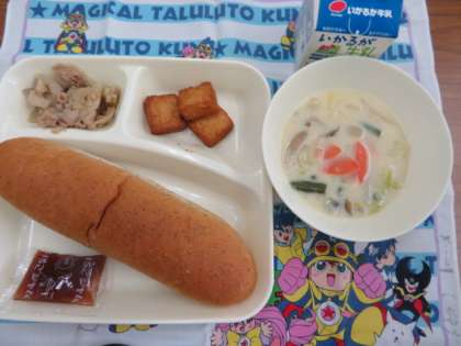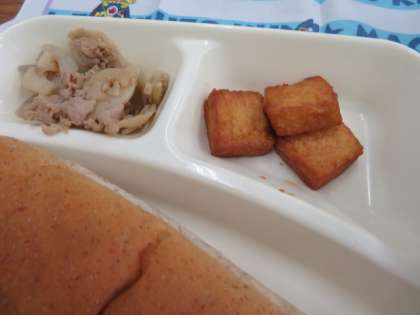 白菜のクリーム煮、厚揚げのピリ辛じょうゆかけ、豚肉とレンコンのオイスターソース炒め、ライ麦パン、牛乳でした。