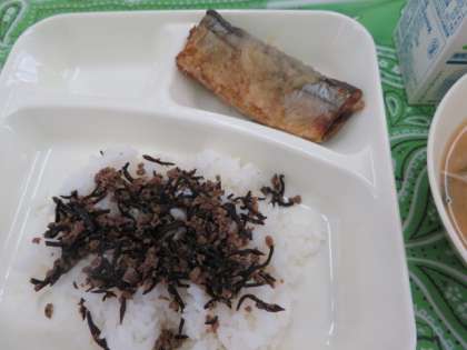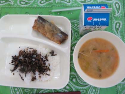 献立は、さんまのみぞれかけ、みそ汁、牛ひじきそぼろ、ごはん、牛乳でした。