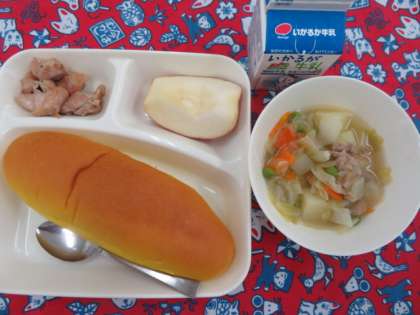 献立は、鶏肉のガーリック焼き、豚肉と野菜のスープ煮、りんご、パンプキンパン、牛乳でした。