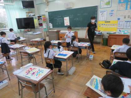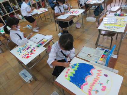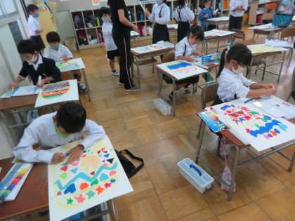 「ふしぎなたまご」というテーマでクレヨンで描いたたまごに絵の具でさらに色を塗る活動をしています。