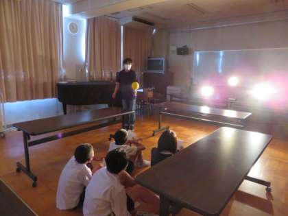 全面からの照明(太陽の光)を受けて、地球上にいる子どもの周りを指導者が球体をもって移動すると、子どもたちからは、順に新月、三日月、半月、三日月、満月と見えました。