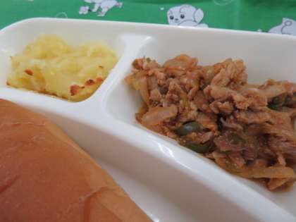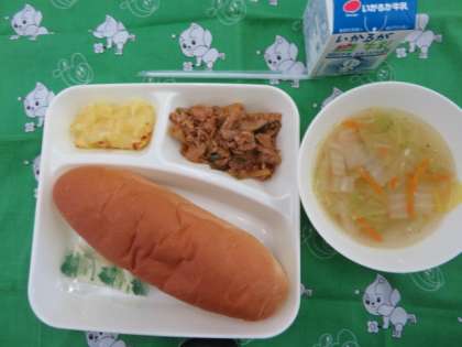 献立は、豚肉と野菜のケチャップソテー、スープ、スイートポテト、マーガリン、コッペパン、牛乳でした。