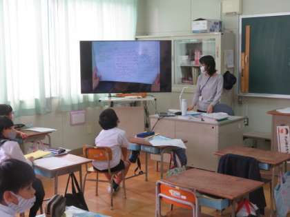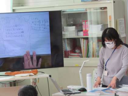 最後に各班で一つ選び、実物投影機に映してよかったところなどを紹介していました。