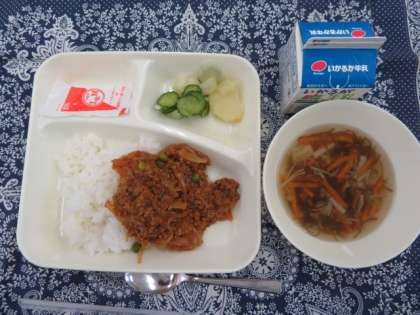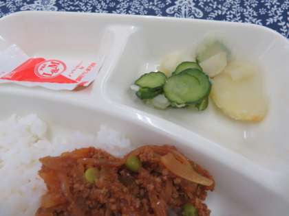 今日は、タコライス、もずくのスープ、じゃがいもときゅうりのサラダ、牛乳という沖縄風の献立でした。