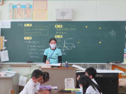 かげのでき方と太陽の関係について、かげの方向や長さなど気が付いたことについて意見を交流しまとめています。