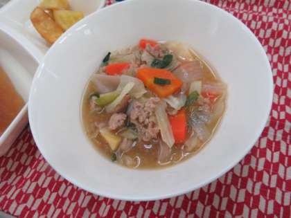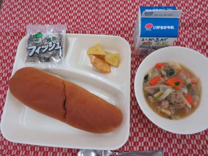 献立は、豚肉といかの中華煮、だいがくいも、ミニフィッシュ、黒糖パン、牛乳でした。