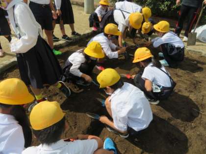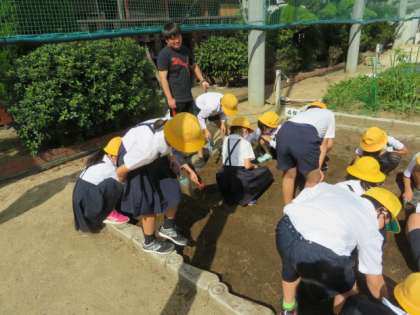 4年生が学習園で、アブラナの種まきとネギの苗を植えるために、整備をしていました。