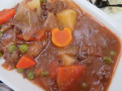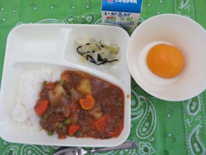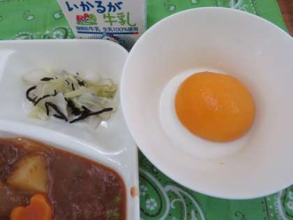 献立は、ハヤシライス、キャベツのひじきドレッシング、黄桃(缶)、牛乳でした。