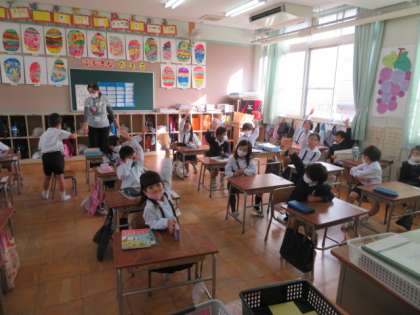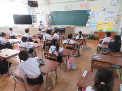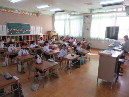 1年生教室では、放送で図書委員会の発表をしっかりと聴いていました。